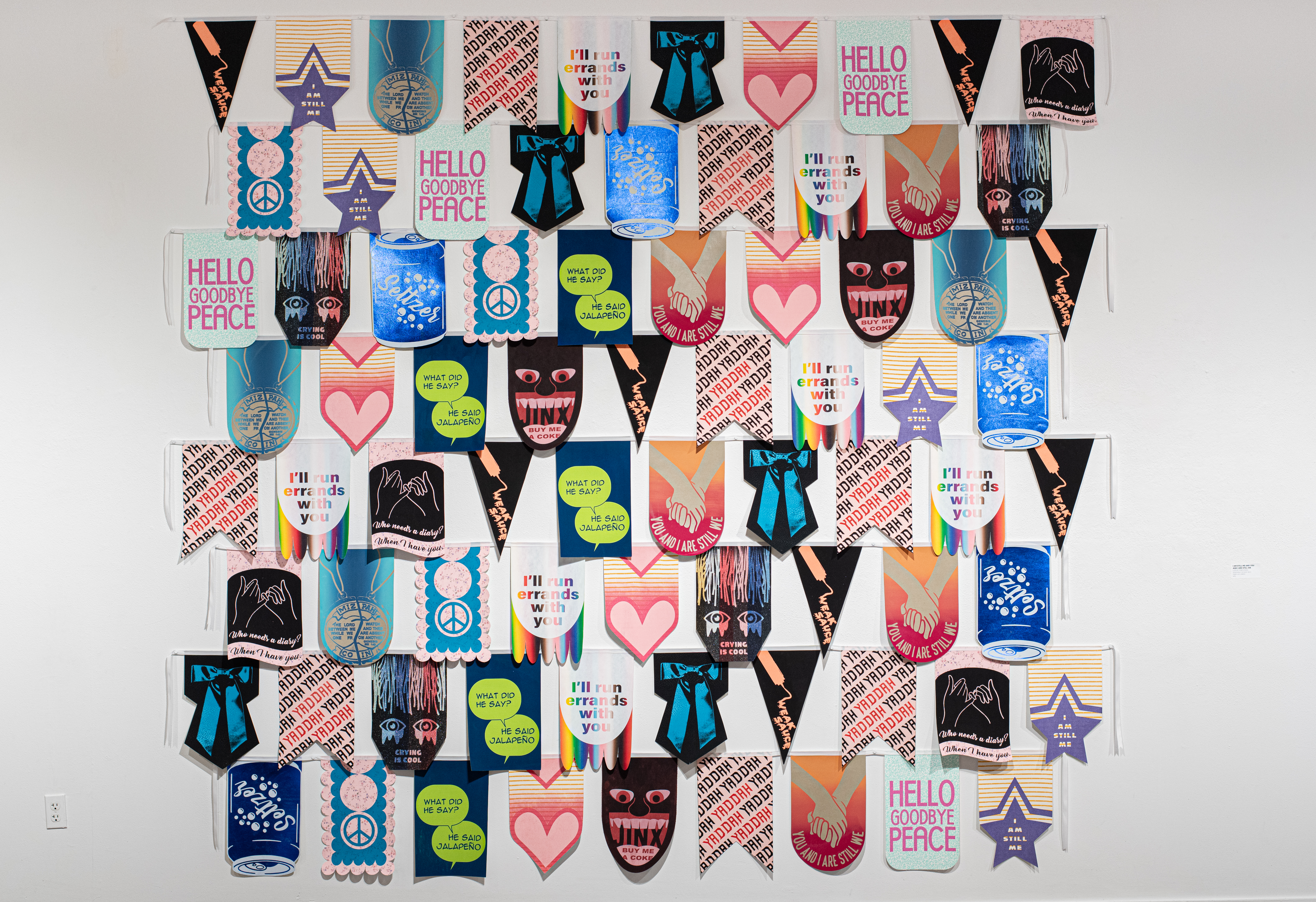 In this exhibition, artists Leslie Friedman and Tamsen Wojtanowski explore self-care, or self-nuturing, through ideas of friendship, nature, escape and play. Working with print as their point of origin, each artist explores the many variations of the process of print and the ways in which it might collaborate with other mediums or presentations, such as drawing, painting, fiber art, and installation. The works created contain delicate moments therein, but are resoundingly substantial in their use of material, commanding in their use of space, muscular in their application of color.