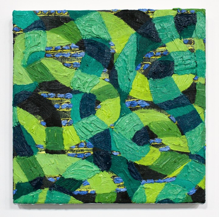 My work is rooted within ecology and presents itself as abstract spaces of color, layered patterns, and material depth. I’m interested in the fundamental building blocks of growth: fractals, mathematics of space, and theories of dynamic systems. Often, the work creates perspectives of life at the infinity level. Twisting snakes overlap distorted grids with thickened paint that can read as microcellular intersections or mapped out macro vantage points. I like the tangle – it toys with the grief around our environment and histories, as well as the celebration of life cycles and the plastic possibilities of color and pattern building.